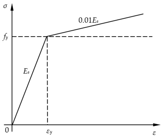 The stress–strain relationship curve of the steel bar adopts a typical double-line model. The steel bar can be considered completely elastic before yielding, and it is approximately simplified as a gentle diagonal after yielding. The elastic modulus in the strengthening stage is approximately 0.01 of the initial elastic modulus, Es. The constitutive relation of steel bars is shown in Figure 1. The specific parameters of the steel bar in the ABAQUS model are obtained according to the material property test: the ultimate strain εu = 0.07, the initial elastic modulus is 2.0 × 105, and Poisson’s ratio is 0.3.