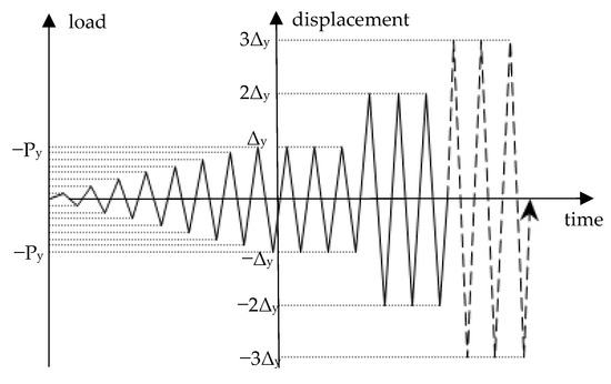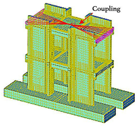 The accurate simulation of boundary conditions is the premise to ensure the reliability of finite element calculation results. The lower end face of the base of the specimen is anchored with a fixed end, which is consistent with the experimental conditions. The vertical load of the numerical simulation space structure is calculated according to the axial compression ratio, converted into a uniform load, and applied to the loading beams (Figure 3). The horizontal load adopts the form of low reversed cyclic loading, which is realized by force–displacement loading introduced by the “Specification for seismic test of buildings” (JGJ/T 101-2015) [31]. At the initial stage of loading, the force loading method is adopted, and the force gradually increases according to the amplitude. Each stage is loaded with one cycle, and the size is a multiple of 50 kN. After the yield displacement is reached, displacement loading is used instead. The displacement loading is carried out with the amplitude loading according to the integer multiple of the yield displacement, and three cycles are performed for each stage until the specimen reaches the failure state. Figure 4 shows the simulation of the cyclic loading history. Py and Δy represent yield load and yield displacement, respectively. A reference point, RP, is set at the top center of the spatial structure model, the reference point is connected with all nodes on the loading beam surface at the near end and the far end by “coupling” (Figure 5), and the horizontal force and horizontal displacement are applied at the reference point, RP (Figure 6).