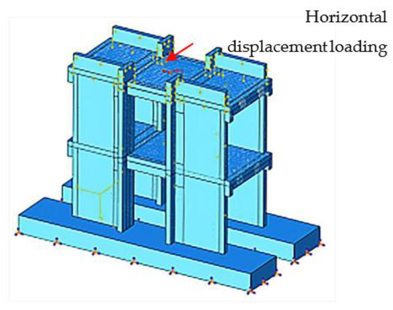 Two analysis steps are set in the model calculation. In the first step, the base is set to a fixed end. The contact relationship between components is set. Vertical loads are applied. In the second step, the displacement outside the two side faces of the loading beam parallel to the wall surface is limited to prevent the wall from losing stability during the loading process. Then, horizontal loads are applied.