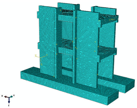 The mesh division has a direct impact on the accuracy of the finite element calculation. The swept mesh method is mainly used to divide the model. The cutting surface is set during mesh generation to make the mesh generation more regular. The mesh size of all elements, such as steel bars, wall piers, coupling beams, floor slabs, loading beams, and bases, is taken as 0.05 m. The grid of the spatial structure model is shown in Figure 7.
