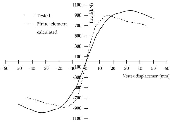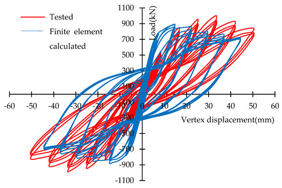 The yield load and yield displacement were obtained by unidirectional pushover loading on the two-story spatial structure specimen of the prefabricated ECC/RC combined shear wall. After that, low-cycle repeated loading is carried out, and the load–displacement hysteresis curve of the numerical simulation and test measurement [22] can be obtained, as shown in Figure 8. The load–displacement skeleton curve is obtained, as shown in Figure 9. Figure 8 and Figure 9 show that the load–displacement hysteresis curve and the load–displacement skeleton curve of the numerical simulation of the specimen are approximately consistent with the experimental test results. However, the finite element method shows a slightly stiffer rigidity and a lower displacement. The reason for this is that the finite element calculation method uses the finite degree of freedom to approximate the infinite degree of freedom in the real structure. The finite element solution is equivalent to making the structure deform according to the given shape function. Compared with the real situation, the constraints are increased in the finite element simulation, so the stiffness is larger than the real solution. Correspondingly, the displacement is a little smaller.