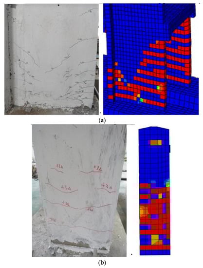 Comparison of experimentally measured cracks and finite element simulation cracks. (a) Experimentally measured cracks and finite element simulation cracks of the web; (b) Experimentally measured cracks and finite element simulation cracks of the flange.
