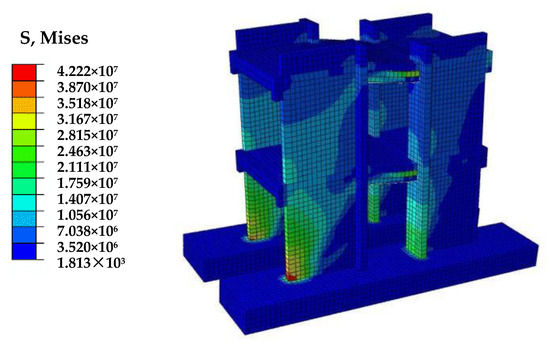 Figure 11 shows the stress distribution of the concrete and ECC of the spatial structure specimen of the prefabricated ECC/RC combined shear wall calculated by finite element under the peak load. It can be concluded from Figure 11 that the internal force distribution of the wall piers is a bending-shear distribution under low cyclic loading. The bottom bending moment is larger, and the concrete in the compression area bears a larger compressive stress. The stress distribution in the compression zone of the flange walls is relatively uniform, and the stress concentration occurs in the compression zones at the edges of the webs. The main reason for this is that the area of the compression zone at the edge of the T-section web is small, the pressure diffusion zone is small, and the phenomenon of stress concentration occurs. It is predicted that if the ECC material with better deformation performance is used in the compression zones of the web edges, the damage to the wall piers will be reduced.