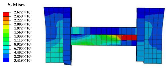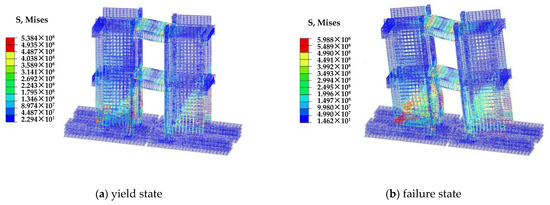 Figure 15 shows the von Mises stress nephogram of the steel bars in the spatial structure specimen of the prefabricated ECC/RC combined shear wall at the yield state and the failure state. From Figure 15, we can see that the steel bars reach yield at 538.4 MPa, and the maximum stress reaches 598.8 MPa in the failure state. The areas with high reinforcement stress are the tension area and the compression area of the first floor walls and the end of the coupling beams due to the large bending moments or shear forces subjected.