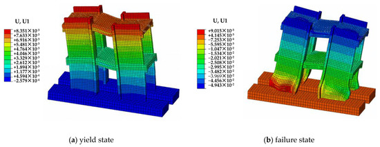 Figure 16 shows the horizontal displacement (U1) of the spatial structure specimen of the fabricated ECC/RC combined shear wall in the yield state and failure state simulated by the finite element. We can see that the displacement at the top of the structure specimen is the largest and decreases as it decreases. The vertex displacement at the loading beam is approximately 7.4 mm when the prefabricated ECC/RC combined shear wall yields, and the vertex displacement is approximately 44.4 mm when it fails.
