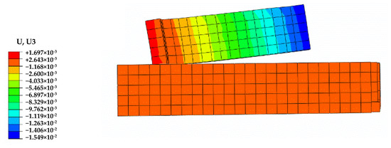 The vertical opening displacement of the contact surface between the wall pier and the base of the fabricated ECC/RC combined shear wall simulated by the finite element is shown in Figure 17. When the wall pier is in tension, the vertical opening displacement reaches 15.49 mm, which can be seen in the data of U3 in the dark blue figure of Figure 17. Of course, the unit of measurement in the figure is meters. This indicates that slip failure along the contact surface will occur at this same position, which is consistent with the damage measured in the test (Figure 18).