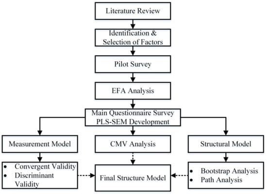 The target sample size for the quantitative survey that will analyze the primary questionnaire is 207, with a minimum of 100. The primary questionnaire survey, which originated from EFA, had questions on 15 unique obstacles to DTT. In order to analyze response rates effectively, demographic information was also gathered. Three hundred fifty Malaysian contractor firms specializing in DTT construction received the survey. Analysis was accomplished with the use of Structural Equation Modeling (SEM). In the 1980s, SEM was developed as a method for testing hypotheses regarding the relationships among latent variables and the observed data. The first model in structural equation modelling (SEM) is the measurement model, and it uses Confirmatory Factor Analysis (CFA) to enrich the model by validating the validity and reliability of the measuring variables against pre-set criteria, thereby linking the constructs with the latent components [,]. The second model, a structural one, calculates variances, tests assumptions, and adjusts those that best represent the data. Opoku et al. (2022) and Thiong’o and Rutka (2022) stated that fine-tuning the conceptual model to the point where it can be utilized to test the hypothesis involves exchanging the correlation among the components for the postulated causal relationships [,]. Based on the results of an EFA analysis performed on the previously identified obstacles to BIM obtained from the aforementioned literature research, a conceptual framework for SEM assessment was constructed in this study.