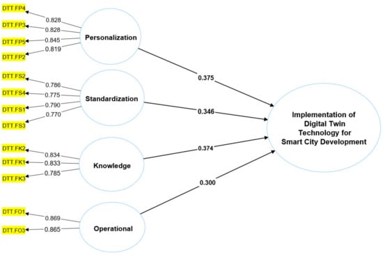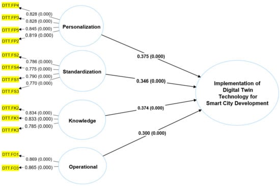 In operational construct, significant barriers are: DTT.FO1 “Maintaining reliable operation,” and DTT.FO3 “Bringing it all together.” The operational construct further indicated the path coefficient of 0.300 with the implementation of DTT for smart city development. Reliable operations are always important in smart city development, and as indicated by the study, it is evident that the operational construct indicates barriers in the maintenance of proper and reliable operations that might result in the DTT’s contribution to the sustained growth of smart cities. It is a highly important factor in terms of increasing the efficiency of overall development projects where operational barriers can be effectively removed if more attention is given to maintaining reliable operations. Existing studies have also indicated similar behavior [,]. The unique aspect of this construct is that it has shown significantly less relativity with the implementation of DTT for smart city development as its path coefficient is lower as compared to the other three constructs. This is significant in terms of raising further awareness and also increasing the chances of success where the operational and other constructs can contribute well to the development of smart city projects if the barriers are removed according to the significance level indicated in each construct [,]. Further, it is clear that all the constructs indicate barriers that could lead to the appropriate implementation of DTT, and positive implications are observed that could be used in both a practical and theoretical manner to contribute to the development of smart city projects with DTT.