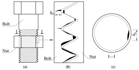 Schematic Diagram of Thread Damage: (a) Bolt and nut; (b) Thread tooth damage amplification diagram; (c) Ⅰ-Ⅰ cross-section.