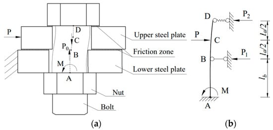 Figure 2a shows the lateral vibration loading [] diagram of bolt connection. HSB is subjected to preload P0 and lateral load P during operation. Assuming that one side of the lower steel plate is fixed, the contact interval between the steel plates is the friction interval, and there is also a friction zone between the nut and the upper steel plate, with friction f. When the friction coefficient is very small, the apparent friction is neglectable. In the case of mutual restraint of bolts and nut threads, due to the action of transverse load P, the upper and lower steel plates are staggered, and the screw is bent and deformed, resulting in bending moment M. In order to simplify the calculation of bolt forces and bending moments, the bolts located in the steel plate are extracted separately. The contact position between the nut bottom and the steel plate is set as point D, project the center of the upper plate thickness onto the screw to point C, the contact position between the upper plane of the lower steel plate and the screw is set as point B, and the fixed place between the nut and the screw is set as point A, the simplified diagram shown in Figure 2b.