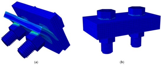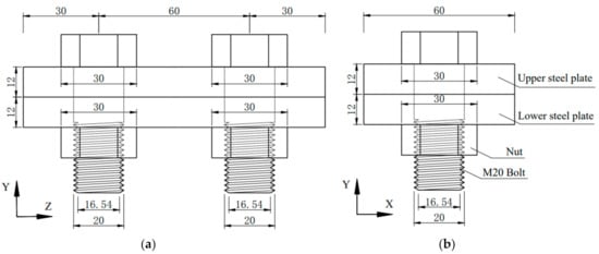 Based on the analysis and research of the mechanical model, the bolt nut connection pattern shown in Figure 4 is set in this experiment. In order to better distinguish the orientation, the model is set to have the Z axis along the long side of the steel plate, the X axis along the short side of the steel plate, and the Y axis along the thickness of the steel plate. The selected bolt is 10.9 grade M20 fine-tooth HSB, the pitch is 2.5 mm, the difference between the screw hole and the screw is 0.4 mm, and the two plates between the bolts are steel Q390B quiet steel sample plates. Our research refers to the Chinese code Technical specification for high strength bolt connections of steel structures (JGJ 82-2011), selects 10.9 s high-strength bolts, corresponding to the preload value of 155 kN. Young ‘s modulus E = 210 GPa, Poisson ‘s ratio μ = 0.3, friction coefficient μs = 0.15, density ρ = 7850 kg/m3, the Young ‘s modulus E = 198 GPa, Poisson ‘s ratio μ = 0.3, friction coefficient μs = 0.15, density ρ = 7850 kg/m3 are set for bolts and nuts. The setting of material properties refers to Reference [].