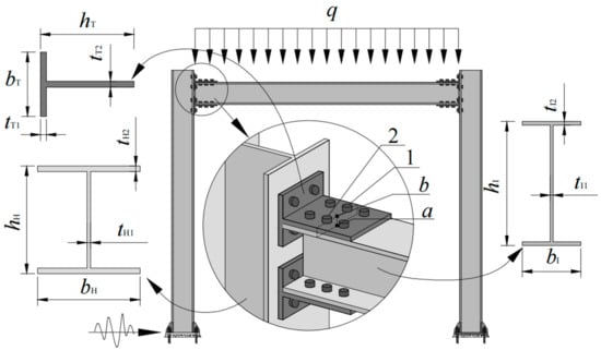 First, a framework model is designed as shown in Figure 5. The column adopts H-type steel, and the section size is H350 350 × 12 × 19 . The beam adopts I-type steel, and the section size is I400 200 × 4 × 12 . The connecting plate adopts T-shaped steel, and the section size is T350 300 × 12 × 24 . Referring to the time and acceleration data of the El Centro earthquake [] measured by the United States Coast and Geodetic Bureau, the seismic load is applied to the bottom of the frame model in case of a large earthquake of 0.5 g, and the analysis step length of the frame model simulation is 32 s.