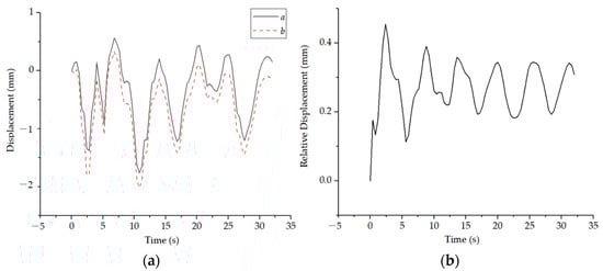 Output data curve of time and displacement: (a) Displacement change of point a and point b; (b) Relative displacement of point a and point b.