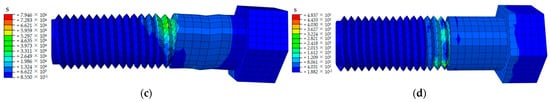 Based on the previous scheme setting, linear load and seismic displacement is applied to obtain data by using ABAQUS software. Figure 8 shows the three-dimensional stress model of UDHSB under linear load and seismic load respectively. From Figure 8a,c, it can be found that the bolt has great deformation under linear load, and there is obvious dislocation distortion in the smooth area of the bolt without thread. There is obvious stress concentration in the transition position between the smooth area and the thread area, and there is dislocation deformation in the contact steel plate area. It can be found that from Figure 8b,d, the bolt does not have excessive deformation under seismic load, but obvious stress concentration at the transition position between the smooth zone and the thread zone. It can be inferred that the closer to the transition position of the thread damage, the more likely it is to make the bolt fail.