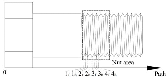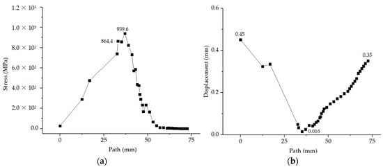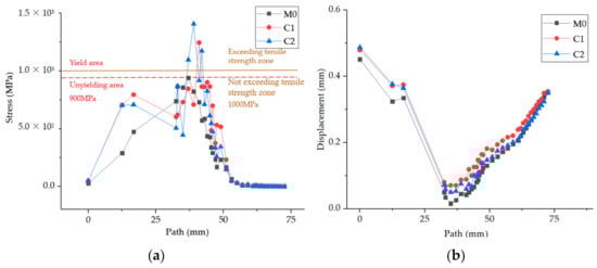 From Figure 15b, it can be found that the displacement value along the path shows a downward trend as a whole, the displacement reaches the minimum value when it transitions to the position of the thread area, and then the displacement value along the path shows an overall upward trend.