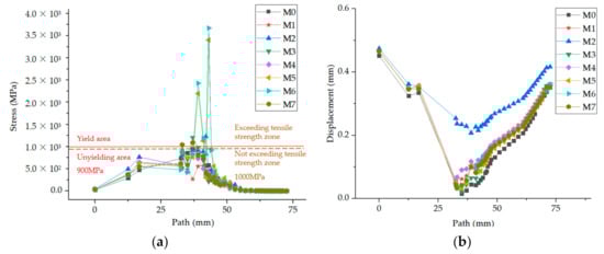 Under different working conditions, the model of M1 to M7 is established and the seismic load is applied. M0 represents the model of UDHSB. The specific crack distribution position can be seen in Figure 11. Figure 12 shows the stress and displacement distribution along the length path of the cracked bolt. It can be seen from Figure 12a that the stress gradually increases along the path, and the stress value rises sharply when it transitions to the thread area. The maximum stress of the M1 model is 641 MPa, the maximum stress of the M2 model is 1229 MPa, and the maximum stress of the M3 model is 1206 MPa. The maximum stress of the M4 model is 896 MPa, the maximum stress of the M5 model is 3401 MPa, the maximum stress of the M6 model is 3670 MPa, and the maximum stress of the M7 model is 1007 MPa. After that, the stress value along the path generally decreases, and it will rise abruptly at the crack, but it is not as high as the value at the first rise. After the fourth ring of the thread, the stress value begins to tend to zero. From Figure 12b, it can be found that the displacement value along the path shows a downward trend as a whole, and the displacement reaches the minimum value when it transitions to the position of the thread area, and then the displacement value along the path shows an overall upward trend.