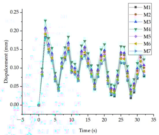 Figure 13 shows the curve of time and displacement derived from the position of the second thread base. Comparing the M1 to M7 models, it can be found that the displacement values of these models are not different, and they all present ripple curves within 0.25 mm. Among the seven models, the displacement generated by M4 is relatively larger, and the displacement generated by M1 is relatively smaller, while the displacement value of other models is in between. From the perspective of changing the crack location, the larger the number of circles where the crack location is located, the larger the displacement will be. The change of crack number has little effect on displacement. The greater the crack depth, the smaller the displacement.