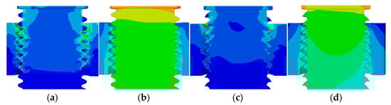 The bolt simulation stress S and displacement U of thread tooth deformation. (a) C1-S; (b) C1-U; (c) C2-S; (d) C2-U.