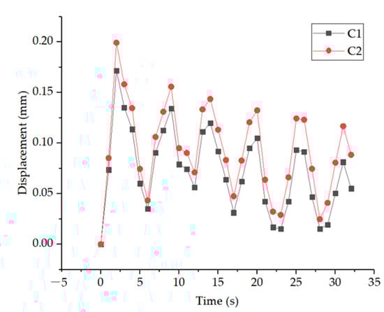 Figure 16 shows the curve of time and displacement derived from the position of the second thread base of C1 and C2. The displacement values of C1 and C2 fluctuated within 0.2 mm with time. It can be seen that the destructiveness of the two damage modes of C1 and C2 under earthquake action is still within normal range, and it can be persisted for a period of time for continuous use.