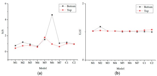 Take the second round of thread as the main research point, extract the stress value of the second round of thread bottom and top, compare the multiple of DHSB and UDHSB, and obtain the curve as shown in Figure 17a. It can be seen from the contents of the previous section that the maximum displacement of the bolt occurs at the top nut and the bottom of the bolt, so the displacement data of the two positions are extracted to compare the difference between the damaged high-strength bolt and the undamaged high-strength bolt, which is shown in Figure 17b.