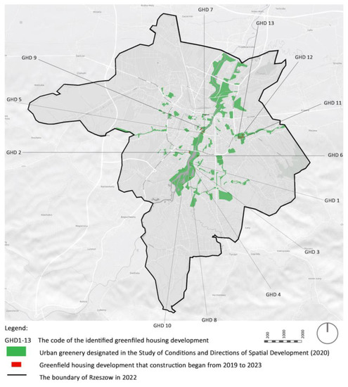 The overarching goal of this paper is to analyse the transformation of UG into GHD from 2019 to 2023 in the medium-sized city of Rzeszow by evaluating the validity of references to the greenery in advertising texts on the developers’ websites. Furthermore, to assess the impact of the proposed greenery-related changes on UGI. The crucial criteria for selecting an urban area in Poland for the exploratory case study were: a population between 100,000 and 500,000 inhabitants (medium-sized city), the positive natural increase in 2021 (the latest available version of the Demographic Yearbook of Poland), the need for greater compactness, density, and urban greenery to create a compact urban form that was highlighted in the latest development strategies, and the presence of GHD with available advertising websites. Potential cases were explored through documentation analysis, including online sources (e.g., the websites of municipal councils, planning departments, and Statistics Poland) and city plans through ArcGIS 10.8.2 Software and Geoportal 2 Software. The natural increase was investigated using the latest available version of the Demographic Yearbook of Poland [72]. Although many medium-sized urban areas were identified, only two cities with a positive natural increase in 2021 were determined: Rzeszow and Bialystok, both located in eastern Poland and with an advanced number of GHD. Finally, Rzeszow was selected, as GHD within urban borders significantly outnumbered those in Bialystok.