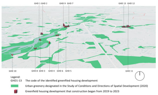 The SCDSD analysis identified areas designated as UG in Rzeszow, which have been marked on the city map in ArcGIS 10.8.2 Software using the land use function. Field observation revealed 13 GHDs consisting of 36 multifamily buildings that had construction works carried out between 2019 and 2023 (Figure 1 and Figure 2). Table 1 presents quantitative data on the UGI area transformed into GHD in Rzeszow from 2019 to 2023. From the data in Table 1, it is apparent that the transformed area of the UGI for GHD differs significantly from 760 square metres (single multifamily building) to 6083 square metres (seven multifamily buildings). In general, 43,852 square metres (4.3852 hectares) of land designated for UGI in SCDSD were converted to GHD between 2019 and 2023.