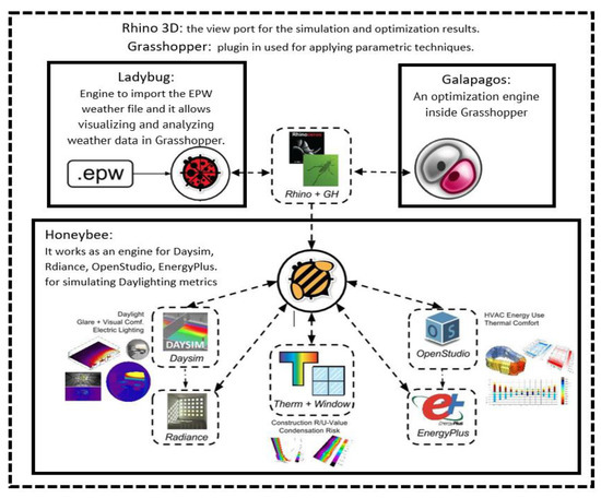 The system works efficiently for climates with clear sky conditions. The study compares the outcome of using CKF with IKF for a case study in Cairo, Egypt. A simulation process is performed by linking Honeybee and Grasshopper as an open-source parametric plugin that is equipped with Radiance and DAYSIM simulation engines. Grasshopper is used to generate 3D parametric models to be connected to Honeybee and Ladybug for daylight assessment and environmental analysis (Honeybee and Ladybug) plugins, which are used as an engine for Radiance and EnergyPlus software. Figure 2 illustrates the relationship between these software [27].