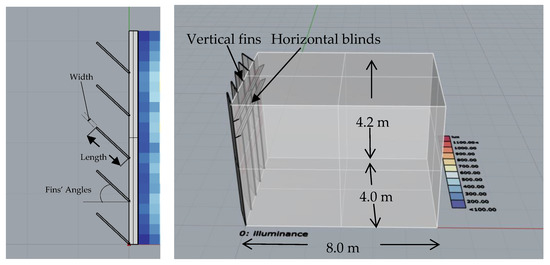 The parameters have two categories; some parameters are fixed. The room height is 4.2 m, and the fins’ height is 4.2 m. The fins’ angles are 55° in March, 60° in June, and 45° in September; the angles were optimized using Galapagos component in Grasshopper before the simulation, see Table 1. The fins in this system move automatically together with the same angle for each fin.