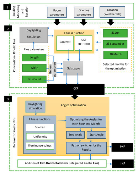 Considering this issue, this study presents integrated kinetic fins (IKF) for office buildings oriented towards the west, which can reduce potential glare and provide uniform daylight. The system uses parametric optimization techniques to improve the indoor daylighting distribution during late working hours by responding to the sun’s movement. Parametric design enables designers to create, manage, and organize complex and dynamic models by integrating different parameters. It opens up a variety of choices and opportunities for potential development and gives the models the ability of responsiveness [25]. IKF can adapt to the solar azimuth and respond to the solar altitude by horizontal blinds. The system can potentially handle the non-uniform daylighting next to the window. For daylighting calculation, various simulation software programs have been used. This study aims to improve the daylighting distribution inside the room for the western façade up to 85% via using IKF within an illuminance level of 200–1000 lux [26].