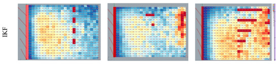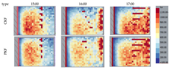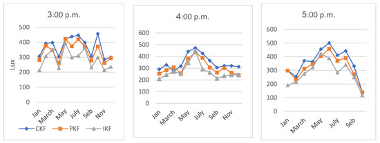 The optimization was made on the 21st of each month. Figure 6 shows the daylighting simulation in August at late working hours, 3:00–5:00 p.m. It shows the improvement of the daylighting distribution by using the proposed system IKF compared to the other systems [32,36].