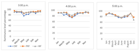 Figure 9 shows an increase in the percentage by 3% and 5% via using PKF and IKF, respectively. The values did not highly improve by using the proposed system as it focused on the distribution of daylighting regardless of the values. In this sense, the values can be between the accepted limits, but the difference between them is still high. Thus, enhancing the illuminance values does not mean having good uniformity and contrast, which refers to a good daylight distribution. That clarifies why IKF and PKF have better improvement for contrast and uniformity than illuminance value. Generally, when the sun’s rays reach the deepest area in space, IKF and PKF can provide better results than CKF since both systems can respond to the azimuthal angle of the sun’s rays.