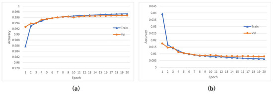 Example of the accuracy and the loss of each epoch during model training. (a) accuracy, (b) loss.