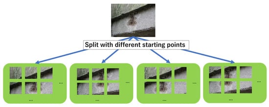 The areas of delamination and the rebar exposure of the image of the training dataset are part of the image; therefore, the image may not be included when the image is divided; however, those images were used as training data, as shown in Table 1. Each dataset was padded after division, and the number of images in each dataset was increased to 17,810 images.