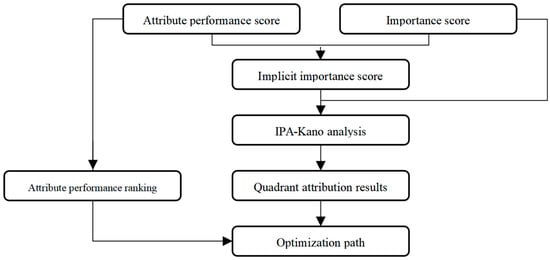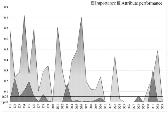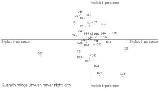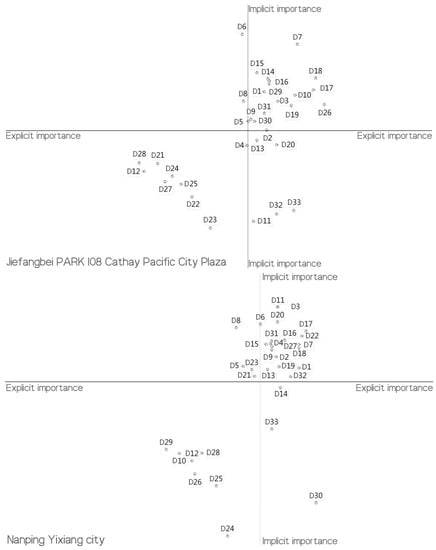 - The IPA–Kano analysis raster was used to present the comparative results of explicit and implicit importance, using importance data to represent explicit importance on the horizontal axis and bivariate correlation analysis data of importance and attribute performance to describe implicit importance on the vertical axis. The mean value of the 33 elements of explicit and implicit importance was used as the central coordinate, and each element corresponded to the quadrant diagram, respectively.