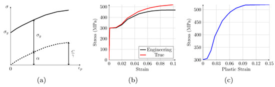 We implemented one kinematic model (see Figure 2a), so the data required for the software were the stress and plastic strain curves of the material, the yield stress, and the constants and of the nonlinear kinematic hardening model. Additionally, the elastic behavior of the material was defined by Young’s modulus and Poisson’s ratio. To simulate the damage to the material, an element death technique was implemented in the software parametric design language (APDL) using the ekill command. The onset of the deactivation of kill elements occurs when the stress or strain threshold is exceeded. The deactivated element remained in the model with a stiffness value close to zero [53]. This technique allowed us to predict the failure mode of the investigated plate by removing the killed elements from the model and required only one failure parameter for calibration.