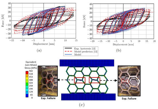 The equivalent plastic strain of 0.1 was used as the limit value for the ekill function, since the maximum stress supported by the material occurs at this plastic strain value (see Figure 2c). The HHSDs studied in [12] are made up of two parallel plates. Due to this distribution, the behavior of each of the plates is expected to be the same, and the total force of the system is the sum of the forces of the components. For this reason, only one plate was simulated in order to reduce computational costs and the force values obtained were multiplied by two to obtain the force of the complete device and compare the results shown in Figure 3a,b. These figures compare the experimental and simulated hysteresis shown in [12] with the curve obtained with the model described in this research, showing good correlation.