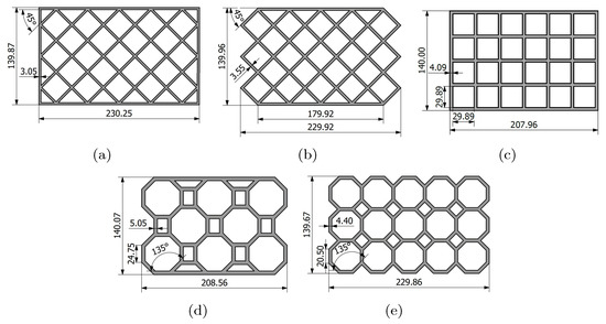 Regarding the failure modes, the variation in the number of diagonals of the design did not modify the fracture zones exposed in Figure 3 and Figure 6d,e.