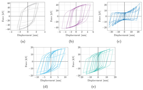Finally, Table 5 shows the variation in the characteristic parameters of the dampers. The results show that the elastic stiffness increased by adding more diagonals to the design, which implied a lower yield displacement and a higher yield force. Additionally, the magnitudes of the maximum and minimum forces of the damper increased, as shown in the envelopes of Figure 14. As the maximum displacements did not vary, but the yield displacement decreased when considering more diagonals, the ductility increased.