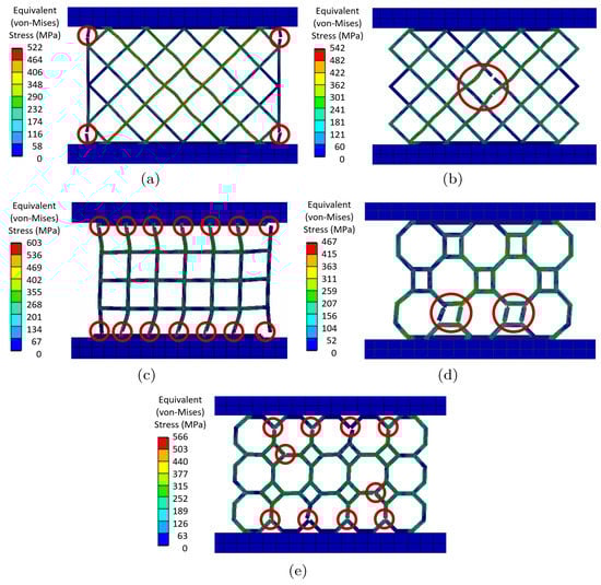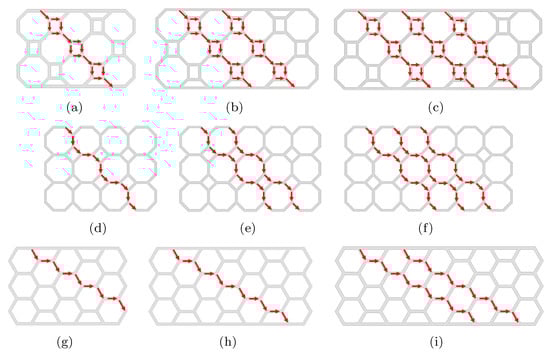 In this stage of the investigation, the aim was to improve the dissipation capacity of P4 and P5 by varying the number of diagonals in the design. As an increasing number of diagonals join the damper support plates, the energy dissipated by the device increases. This hypothesis was also verified by the HHSD n°1 damper, whose original design did not have a full diagonal, as shown in Figure 13g. Thus, the number of diagonals present in P4 and P5 varied, as shown in Figure 13, maintaining their initial dimensions of thickness, depth and height (see Figure 4d,e). In HHSD n°1, the thickness, depth and height used in the calibration and validation of the model were maintained. We chose to keep the dimensions constant and not the volume of material, since Figure 11 showed that thickness had a significant impact on the behavior of the damper. Keeping the volume constant did not allow us to separate the effect of the diagonals from the effect of the thickness in the behavior of the device. It is important to mention that the highlighted diagonals in Figure 13 joined the support plates in one direction, but since the design was symmetrical, we found the same number of diagonals in the other direction.