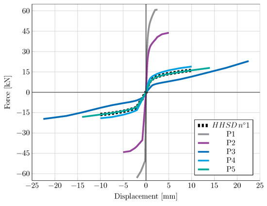 Dampers with a performance equal to, or greater than, HHSD n°1 had elastic stiffness values less than 13 and yielded forces less than 9.2 kN. Thus, they were capable of withstanding displacements equal to, or greater than, 10 mm. In terms of cumulative energy dissipation values, P3 and P5 dissipated more energy than a plate of HHSD n°1 using the same amount of material and supporting larger displacements. At the same applied displacement, P4 was stiffer and dissipated more energy than HHSD n°1; however, due to its stiffness, it could only withstand 16 cycles. Thus, when looking at the total curves, it dissipated a slightly smaller amount of energy. P2 dissipated almost as much energy as HHSD n°1, but displayed a much lower cumulative displacement, which is not a good feature for a damper. P1 was more rigid than P2 and supported very small displacements, so it is not recommended as a hysteretic damper.