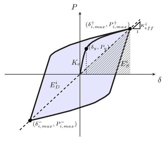 In addition to the parameters in Table 3, dampers are characterized by effective stiffness, dissipated energy, and effective damping, also known as equivalent viscous damping. The effective stiffness of each cycle was the slope between the extreme points of a cycle of the hysteresis curve (see Figure 8) and was calculated using Equation (3) [35]. This value allowed us to determine the elastic deformation energy (), which was related to the effective damping (), as shown in Equation (4) [55]. Effective damping represents the energy dissipation capacity of a hysteretic system and is related to the displacement of the damper [1,35]. Finally, the energy dissipated in each cycle () was the area under the hysteresis curve for that cycle.