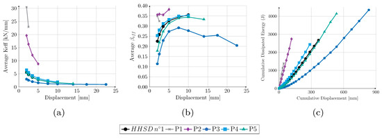The effective stiffness value was calculated for each cycle supported by the damper. However, to simplify its visualization, Figure 9a shows the average effective stiffness of the cycles at the same displacement. In all geometries, a decrease in stiffness was observed as the applied displacement increased. This decrease followed a potential trend in P3, P4 and P5, which had the same behavior of the reference damper HHSD n°1. In P1 and P2, the trend was unclear because they were very rigid and, thus, supported small displacements.