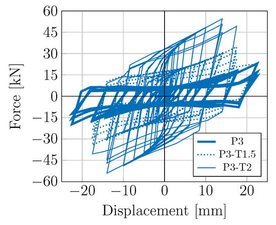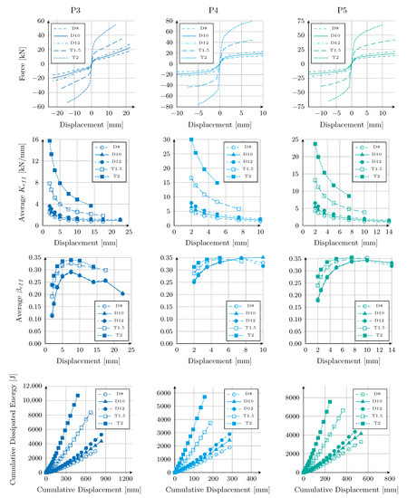 Figure 10 shows the envelope curves, the effective stiffness and damping graphs and the cumulative dissipated energy vs. cumulative displacement for the three dampers. The blue curves correspond to P3, the light blue curves correspond to P4 and the emerald curves correspond to P5. In the envelope curves, D changed, and the shape of the curve remained the same and shifted on the vertical axis, as the supported force increased proportionally to this dimension. The same proportional relationship was also fulfilled for the elastic stiffness shown in Table 4 and the effective stiffness in Figure 10. In contrast, as T increased, the envelope curve had greater curvature in the plastic zone, and the number of cycles decreased (see Table 4). Additionally, modifying T produced a larger change in elasticity and effective stiffness. Regarding effective damping, this value remained the same in the three dampers in which D varied. However, as T varied, the effective damping changed.
