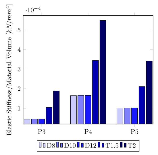 In the cumulative dissipated energy curve in Figure 10, an increase in T implied a sudden increase in the dissipated energy. However, the cumulative displacement that the damper could support decreased significantly. Despite the above, P3-T2 was the plate that dissipated the most energy and had a cumulative displacement of 478 mm, which was higher than the cumulative displacements of all P4 plates and slightly less than the cumulative displacement of P5 at 10 and 12 mm deep. Conversely, increasing D increased the dissipated energy but did not affect the accumulated displacement. To quantify how each of these parameters affected the behavior of the damper, the coefficient between the elastic stiffness and the volume of the material was calculated, as shown in Figure 11. These values showed that T had a greater effect on the elastic stiffness value than D for the three geometries.