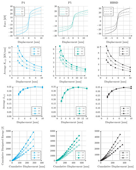 Figure 14 shows the envelope curves, the effective stiffness and damping graphs and the cumulative dissipated energy vs. cumulative displacement for P4 and P5 with one, two and three diagonals and for HHSD n°1 with zero, one and two diagonals. The light blue curves correspond to P4, the emerald curves correspond to P5 and the black curves correspond to HHSD. The number of diagonals in Figure 14 was represented by the number followed by a d. So “2d” means that the damper has two diagonals. In the graphs of effective stiffness, effective damping and dissipated energy, the original design of each damper was represented with triangular markers, since initially P4, P5 and HHSD had one, two and zero diagonals, respectively.