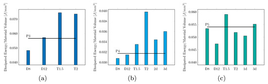 Coefficient between total dissipated energy and material volume of the dissipating plate for P3 (a), P4 (b) and P5 (c) when depth, thickness, and the number of diagonals vary. The black line represents the coefficient of the original damper design.