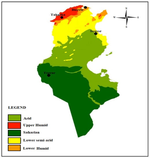 Climatic conditions have a great impact on building thermal efficiency and performance. The scope is focused on the region of Tunisia, due to its strategic location. As shown in Figure 3, the climate of Tunisia is divided into five climatic zones, namely, arid, upper humid, Saharan, lower semi-arid, and lower humid. According to the Köppen–Geiger classification [35], a great difference between the north and the rest of the country occurs due to the chain of the Tunisian ridge, which separates the zones subjected to the Mediterranean climate as humid (for Bizerte and Tabarka), lower semi-arid (for Sousse) and the hot desert climate typical of the Sahara (for Tozeur) (Table 1). The weather data for each city are exported to the EnergyPlus climate file database. The geographic and meteorological data of these regions, as well as the city description, are given in Table 1.
