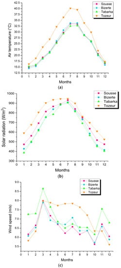 The outdoor temperatures (Tair) as well as the wind speed (w) are given in Ref. [36], while the collected solar radiation data are available in Ref. [37]. Therefore, the corresponding annual climate data are collected from these sources and depicted in Figure 4.