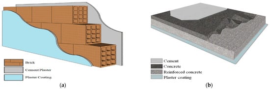 In Tunisia, the brick wall is the conventional structure for residential building construction [37]. Here, the external building wall without PCM (control wall) is composed of three layers: plaster coating, brick, and cement (Figure 5a). On the building roof, four layers were considered: cement, concrete, reinforced concrete, and plaster coating (Figure 5b). Two different configurations were considered for PCM integration into the control wall: (i) PCM located in the outside of the wall (Case 1, Figure 5c) and (ii) PCM located in the inside of the wall (Case 2, Figure 5c). It should be noted that PCM is employed in the wall as an extra layer. The PCM layer thickness is varied between e = 10 mm and 30 mm for these configurations. The thermal performances of these materials, as described in Table 3, were also taken into account in the modeling process.