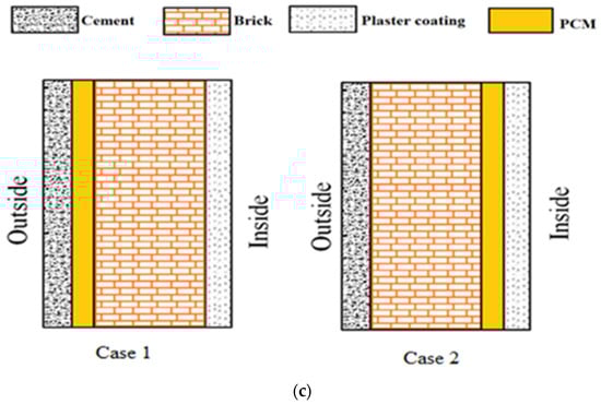 Schematic representation of (a) external wall, (b) roof, and (c) PCM integration.